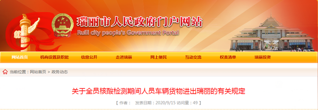 据云南瑞丽市政府网站9月15日消息,瑞丽市新冠肺炎疫情防控工作指挥部发布关于全员核酸检测期间人员车辆货物进出瑞丽的有关规定。