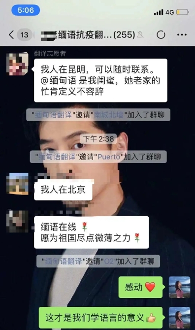 曾莉的手机响个不停,第二条、第三条……截至9月17日上午,加入“素素缅语抗疫翻译公益群”的人数就超过了270人。“翻译志愿者来自五湖四海,有瑞丽当地抗疫工作者和缅籍务工人员、普通市民,还有来自昆明、广州、北京等地学习缅文的中国人。”曾莉介绍,翻译志愿者们自入群开始,就根据自己的时间和工作需求,积极投入翻译。“一直在线上等待任务的有20个翻译,都是接到求助马上进行处理。”