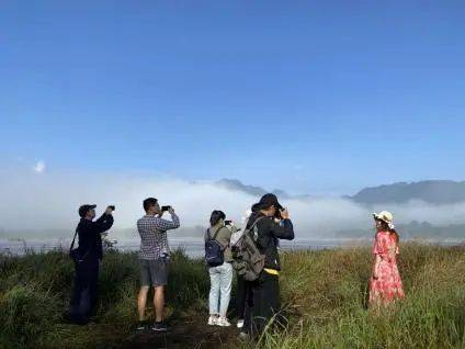 太阳初上,山峰隐现,游人纷纷驻足,留下这美好的瞬间