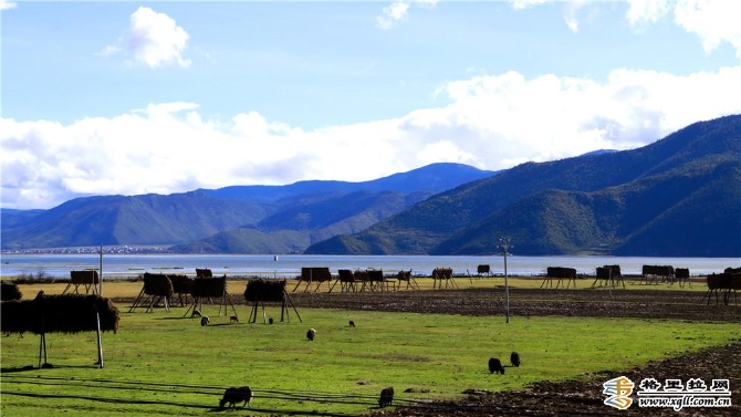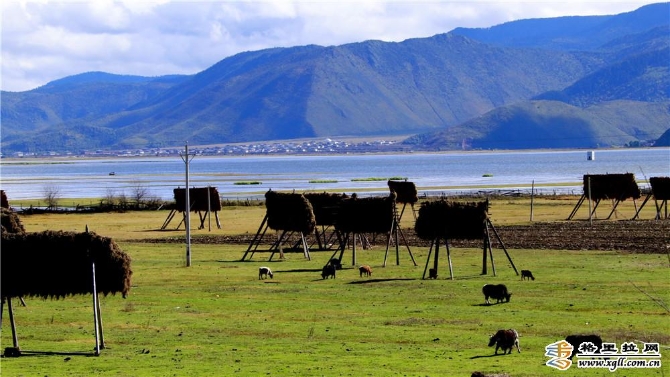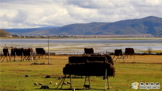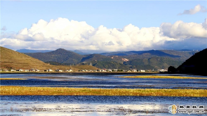 秋天的纳帕海,草原一片金黄,成群的牛羊在草原上悠闲地吃草。远山如黛,倒映于湖泊中,使广阔的草原别具一番诗意。(马建军 摄影报道)