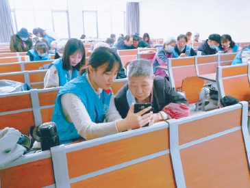 “夕阳再晨”志愿者一对一教老年人学习智能手机。