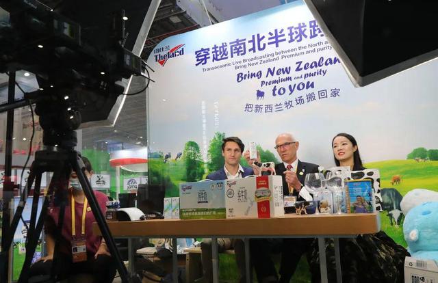 11月8日,新西兰纽仕兰乳业研发总经理罗伊·范登克(中)在进博会展台上搭建的网络直播间出镜带货。新华社记者 方喆 摄