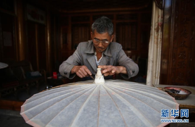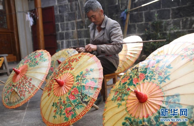 云南省腾冲市固东镇荥阳村有着上百年制作油纸伞的历史,但机制雨伞的出现和其价格优势,让手工制作的油纸伞市场越来越小。近年来,随着当地旅游业的兴起,样式别致、图案精美的油纸伞作为工艺品受到游客青睐,传承百年的油纸伞焕发了新的生机。