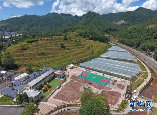这是8月10日在四川省凉山彝族自治州昭觉县四开乡梭梭拉打村拍摄的四川省武警总队援建该村的幼儿园、篮球场和产业园(无人机照片)。新华社 记者刘坤/摄