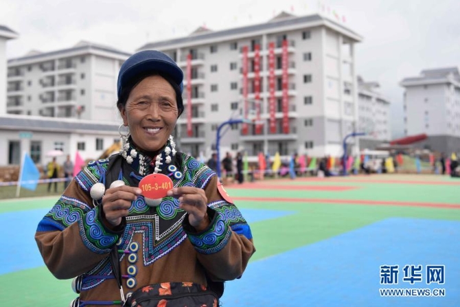 在布拖县依撒社区安置点抽签分房现场,56岁的阿比么日扎展示自己抽中的新家房号(6月21日摄)。新华社 记者胥冰洁/摄