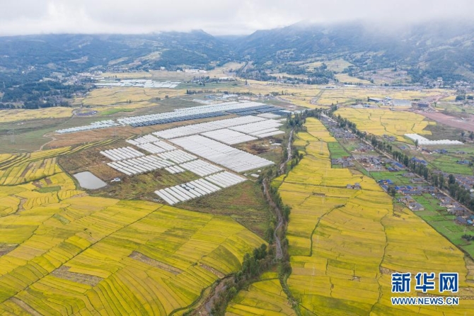 昭觉县阿并洛古乡的美丽田园和农业产业园(10月13日摄,无人机照片)。新华社 记者江宏景/摄