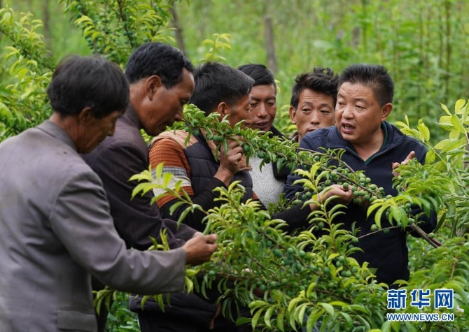 派驻到布拖县觉撒乡的帮扶干部杨永林(右一)在博作村带领村民查看茵红李挂果情况(6月22日摄)。新华社 记者江宏景/摄