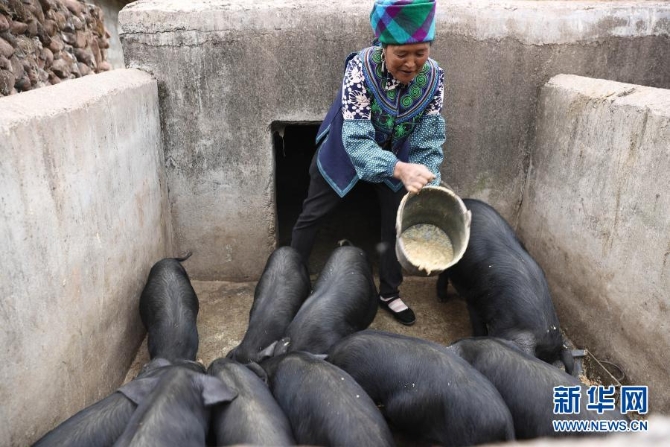 昭觉县火普村建档立卡贫困户曲比子阿木在喂猪(5月11日摄)。新华社 记者江宏景/摄
