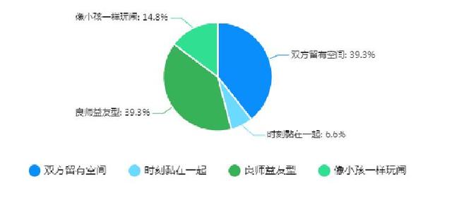 对于喜欢的恋人相处模式,《报告》显示,39.3%人喜欢双方留有空间,同样有39.3%的人喜欢良师益友型,14.8%的人喜欢像小孩一样玩闹,6.6%的人喜欢时刻黏在一起。