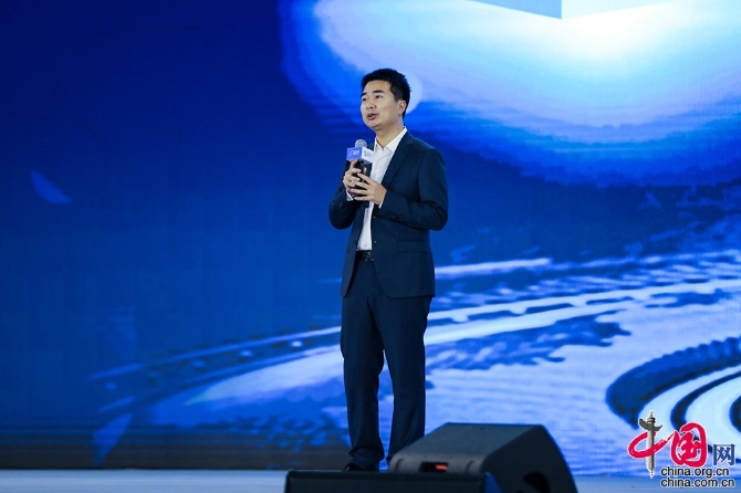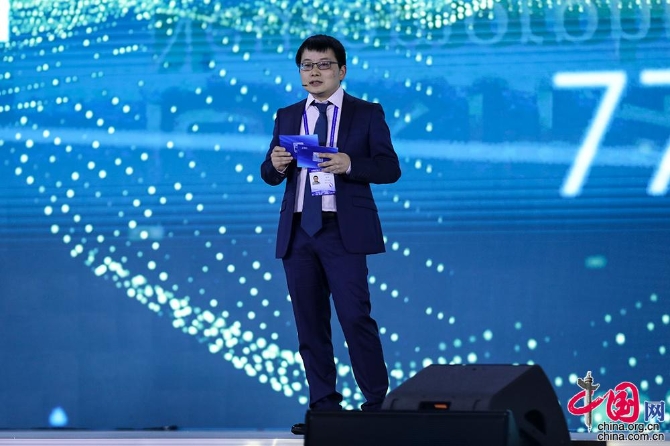 腾讯云副总裁、腾讯会议负责人吴祖榕作为“科技抗击”专项成果代表,介绍疫情期间,腾讯会议在助力复工复产和产业恢复方面的经验和做法。中国网记者 董宁 摄影