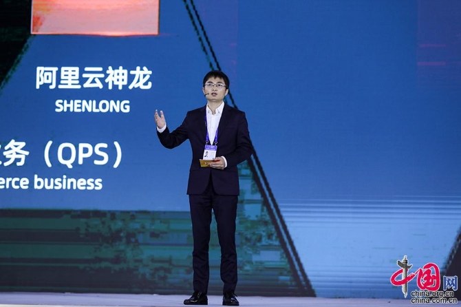 阿里巴巴集团合伙人、阿里云基础产品总经理蒋江伟发布领先科技成果,神龙:新一代软硬一体化虚拟化技术架构。中国网记者 董宁 摄影