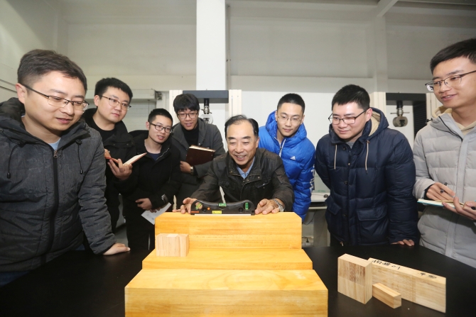 图片说明:空间力学团队徐家福高级工程师(右四)与团队成员测试着陆器各种试验面的材料参数