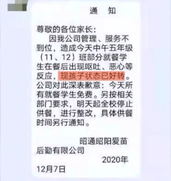 12月7日,昭通昭阳爱苗后勤有限公司通报称:因该公司管理、服务不到位,造成当天中午五年级(11、12)班部分就餐学生在餐后出现呕吐、恶心等反应,现孩子状态已好转。公司对此深表歉意:当天所有就餐学生免费。
