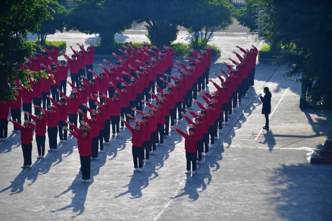 张桂梅在督促学生做课间操(12月2日摄)。新华社发(陈欣波 摄)