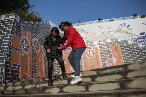 一名老师搀扶张桂梅(左)下台阶(11月30日摄)。新华社发(陈欣波 摄)