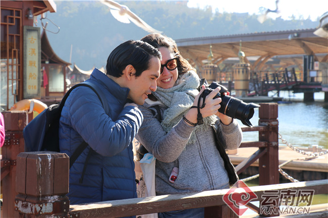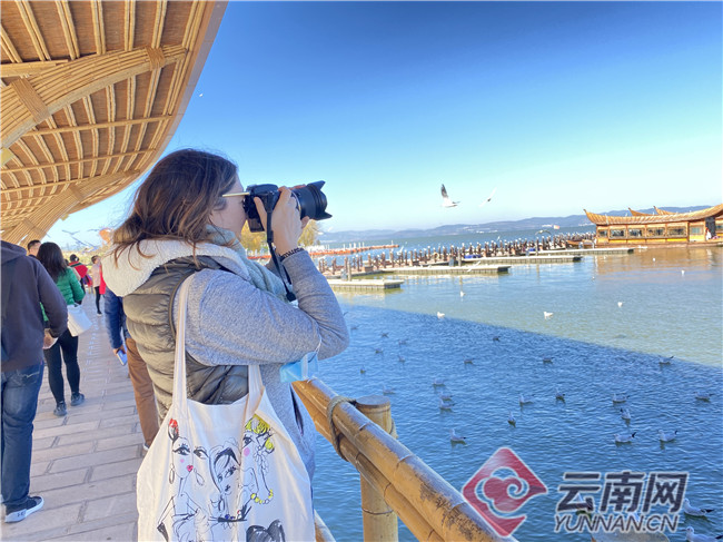 红嘴鸥是昆明冬天的一道风景,这也是人与自然和谐相处的典范。在古滇艺海大码头,晴空暖阳下,记者们也与市民、游客一起观鸥、喂鸥、拍照。来自法国的记者塞西尔拍了不少海鸥的“萌照”,她说:“昆明气候宜人、天蓝水清,还有这些‘小精灵’做伴,非常适合休闲度假。欢乐世界则是以民族文化为主题的游乐场,将文化和旅游结合得很好,很有新意。”