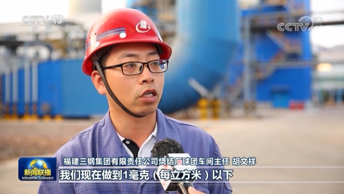 福建三钢集团有限责任公司烧结厂球团车间主任 胡文祥:国家超低排放的环保要求,粉尘浓度是10毫克(每立方米),我们现在做到1毫克(每立方米)以下。领先超低排放标准的5年以上。