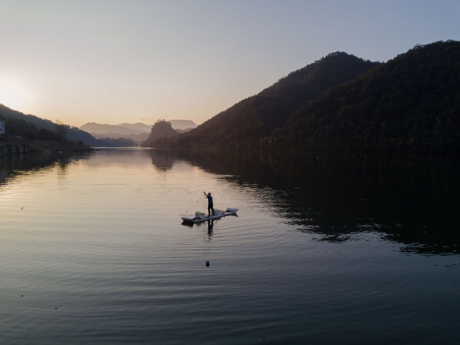 福建省三明市将乐县高唐镇常口村村民在村口的金溪上捕鱼(11月20日摄,无人机照片)。新华社记者 宋为伟 摄