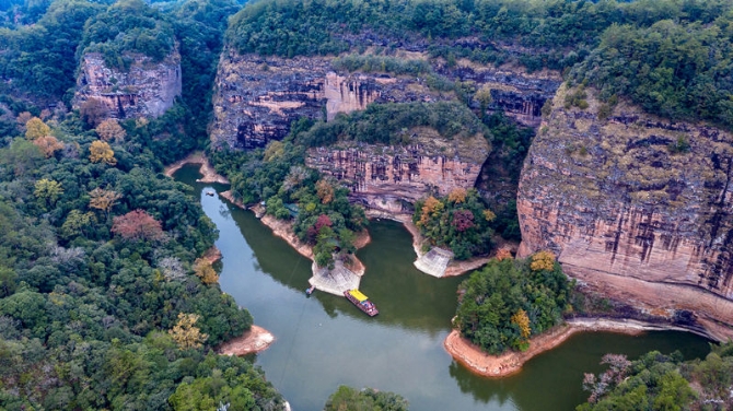 这是12月9日拍摄的福建省三明市泰宁县大金湖景区的水上丹霞景观(无人机照片)。新华社记者 姜克红 摄