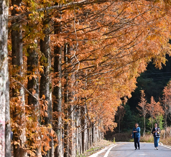 游客在福建省三明市将乐县龙栖山国家级自然保护区水杉大道游览(11月20日摄)。新华社记者 宋为伟 摄