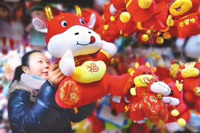 农历牛年临近,在湖北省十堰市鄂西北批发市场,许多商家把“生肖牛”毛绒饰品摆满货架,各种“牛”憨态可掬,深受人们青睐。图为市民在选购生肖牛毛绒饰品。杨显有摄(人民视觉)