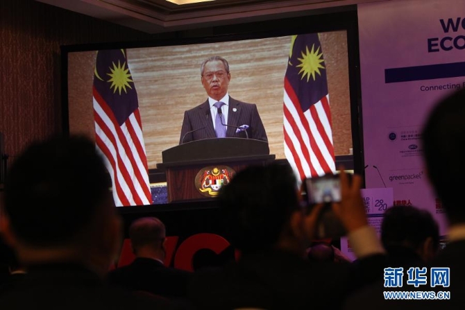12月21日,在马来西亚吉隆坡举行的世界华人经济峰会上,大屏幕播放马来西亚总理穆希丁的视频讲话。新华社发