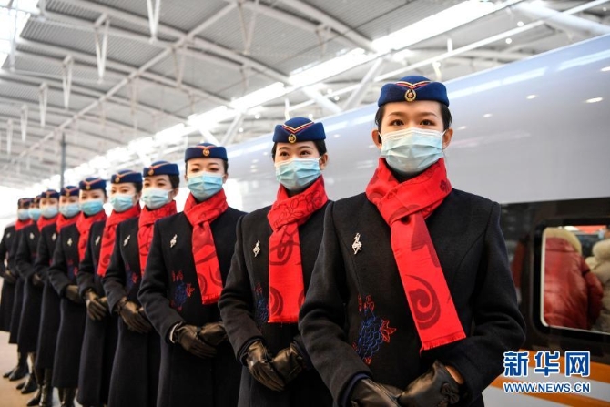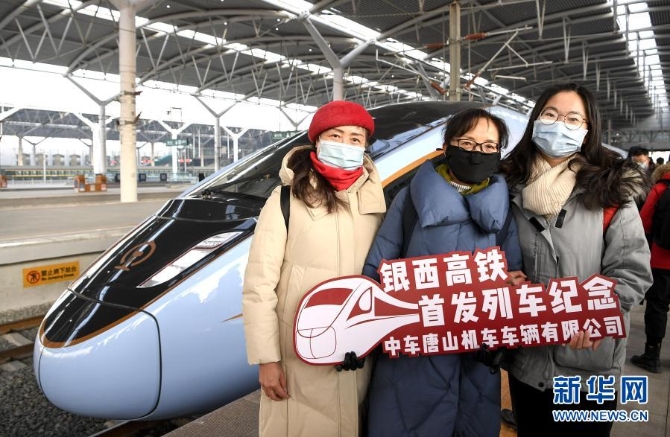12月26日,工作人员在银川站举行的首发仪式上欢迎乘客乘车。新华社记者 冯开华 摄