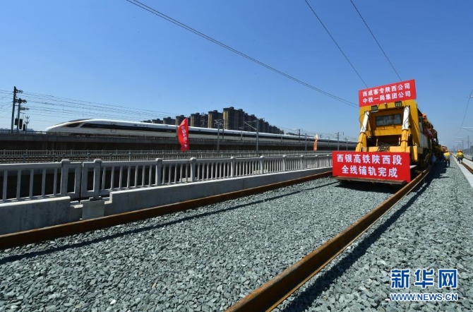 6月18日,由中铁一局新运公司承建的银西高铁陕西段铺轨工程顺利完工。新华社记者 张博文 摄