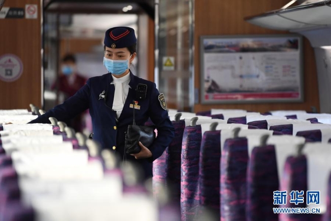 12月12日,银川客运段列车长董芳在银西高铁运行试验动车组列车上巡检。新华社记者 陈斌 摄