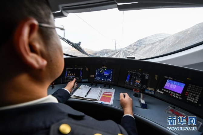 迎水桥机务段动车组司机徐锐驾驶运行试验动车组列车行驶在银西高铁上(12月12日摄)。新华社记者 冯开华 摄