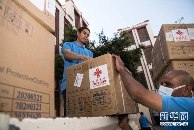 6月24日,工作人员在叙利亚大马士革的叙卫生部搬运中国政府援助的抗疫物资。新华社发(阿马尔·萨法尔贾拉尼摄)
