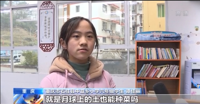 重庆市石柱县中益乡小学六年级学生 谭佳丽:我一直有个问题,就是月球上的土也能种菜吗?我在今天的课上找到了答案。
