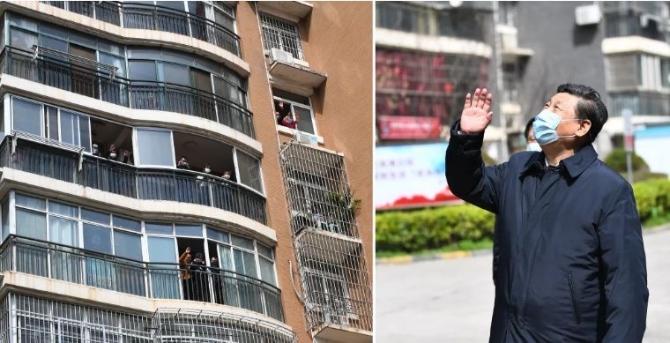 3月10日,中共中央总书记、国家主席、中央军委主席习近平专门赴湖北省武汉市考察新冠肺炎疫情防控工作。这是习近平在东湖新城社区考察时,向在家隔离居住的居民挥手致意、表示慰问(拼版照片)。新华社记者 谢环驰 摄