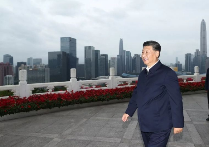 10月14日,深圳经济特区建立40周年庆祝大会在广东省深圳市隆重举行。中共中央总书记、国家主席、中央军委主席习近平在会上发表重要讲话。这是当天下午,习近平在莲花山公园远眺特区新貌。新华社记者 鞠鹏 摄