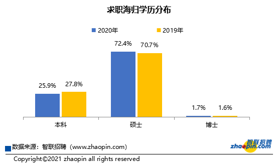 从年龄分布看,求职海归25-34岁群体占比最高,达64.6%;16-24岁的海归占比较2019年扩张4.5个百分点至27.9%;而35岁及以上的求职海归在统计中不足一成。硕士是向国内求职海归的中坚力量,在2019年占整体的70.7%,2020年扩张至72.4%;博士占比1.7%,与2019年基本持平;本科群体占比25.9%,较2019年收缩1.9个百分点。