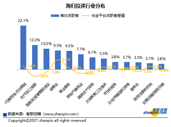 IT/通信/电子/互联网行业集中吸引了22.1%的海归求职者投递简历,占比最高,生产/加工/制造业(12.3%)、贸易/批发/零售/租赁业(10.5%)依次排在其后。与全平台所有求职者相比,海归有意向从事金融业、IT/通信/电子/互联网、政府/非盈利机构、文体教育/工艺美术、文化/传媒/娱乐/体育、商业服务等行业的占比更高。