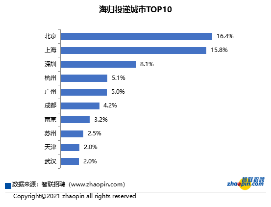 一线城市与新一线城市更具海归人才吸引力,一线城市吸纳了45.1%的求职申请,新一线城市占比在3成。海归投递前十的城市,吸纳了64.2%的海归就业需求,其中排名前两名的北京、上海,合计占超3成,深圳占8%。