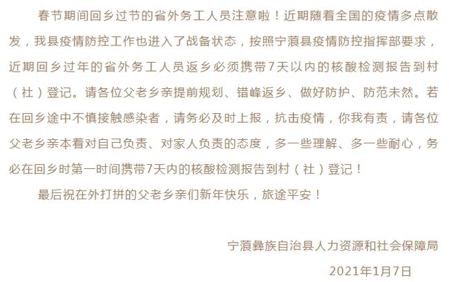 近日,宁蒗彝族自治县人力资源和社会保障局发布信息,按照宁蒗县疫情防控指挥部要求,近期回乡过年的省外务工人员返乡必须携带7天以内的核酸检测报告到村(社)登记。