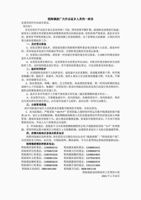 永胜县程海镇新冠疫情防控工作领导小组发布《程海镇致广大外出返乡人员的一封信》,建议返乡人员提前拨打所述村委会电话报备个人信息、拟返乡时间、所在地是否是高中风险地区等信息,以便村委会做好信息登记备案。