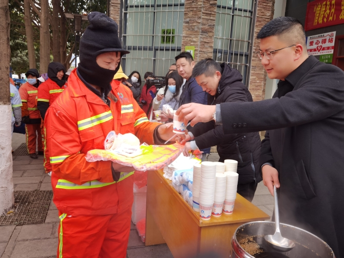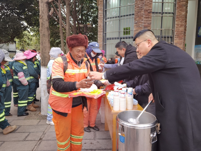据介绍,连日来昆明市迎来大幅降温,环卫工人每天从早到晚坚守在自己的工作岗位上,为这座城市的环境卫生贡献着自己的一份力量。为给广大寒冬中辛苦作业的城市美容师提供更好的服务保障和关怀,官渡区城管局组织开展了“情暖冬日、爱心传递”环卫工作者“五个一”服务关爱活动。活动主要依托环卫爱心驿站,为辖区环卫工人免费提供“一套爱心早餐、一杯暖心姜汤、一份防尘口罩、一双防寒手套、一件防湿雨衣。