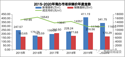 2020年商办市场供应341.75万㎡,成交170.29万㎡,市场均价11603元/㎡,供求比约2.0,市场整体供大于求;同比2019年新增供应下跌17%,销售面积下跌21%,成交均价下跌1%,受市场存量及需求饱和的影响,供、销、价均有所下跌。