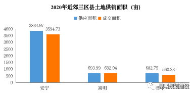 此外,昆明近郊三区县房地产项目已达60余个,更拥有20多家全国知名房企,其中安宁承接主城外溢为主,是目前近郊区域开发项目最多的区域,而嵩明和晋宁则拥有数个千亩以上的文旅大盘。2020年近郊三区县成交与供应量最大的是安宁,安宁土地销售额占三区县销售总额78%,近郊土地出让以住宅为主,晋宁商业用地供应较大,而今年土地溢价能力最高的是嵩明,溢价率达6%