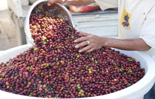 工人正在处理咖啡鲜果。图片来自云南网报道截图。