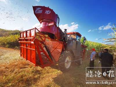 蔗农利用机械收割甘蔗。