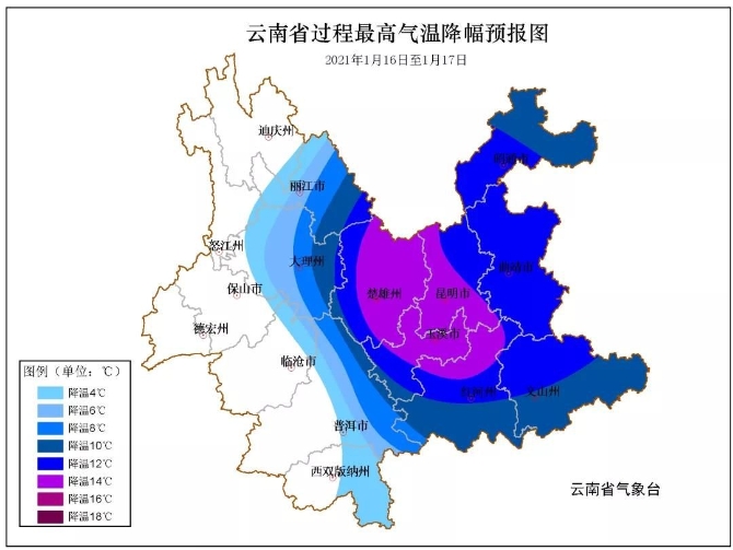 过程期间,滇中及以东以南地区气温下降明显,需注意防寒保暖,昭通、曲靖、文山、红河北部、玉溪北部、昆明、楚雄、大理东部和北部、丽江、迪庆、怒江北部需防范降雪、道路结冰对交通运输、农业、电力设施及居民生活的不利影响。过程结束后,滇东、滇中南部、滇西南清晨部分地区有大雾,需防范低能见度对交通运输的不利影响;滇西北、滇中北部有霜,需防范低温冻害对农业的不利影响。