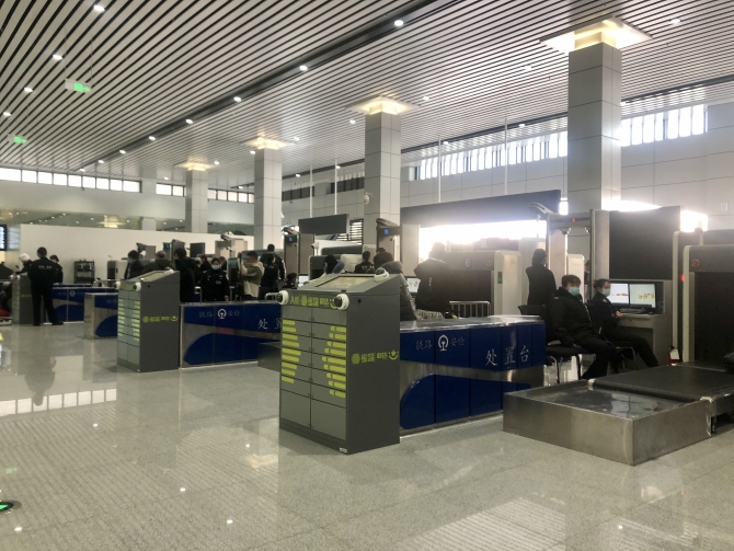 安检作业区位于北广场综合服务厅北面,设有14个安检通道,客流高峰时段能够满足14名旅客同时安检进站。在安检通道旁,新增危险品自弃柜和自助快递柜,若旅客携带了不能带上列车的物品,可使用快递柜将其邮寄到目的地,快递柜上清楚标明了寄件流程,旅客完成身份识别后按照流程操作即可。