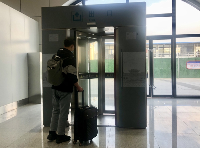 南北广场进出站口均设置了疫情防控区域,安装有自动测温设备。记者上官艳君/摄
