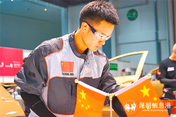 2017年10月18日,第44届世界技能汽车喷漆项目选手蒋应成在阿布扎比比赛现场