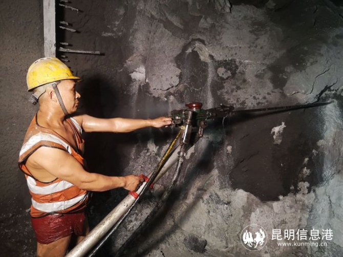 中交二航局施工人员冒着高温在隧道内进行钻孔作业