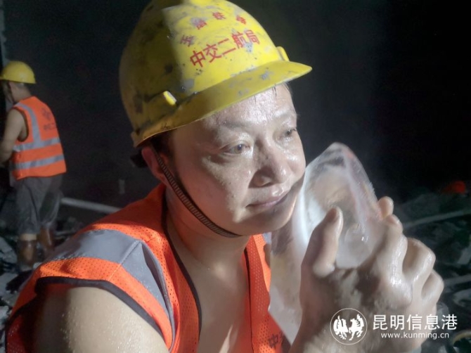 冒着高温在隧道内作业的施工人员每隔十几分钟就要降温